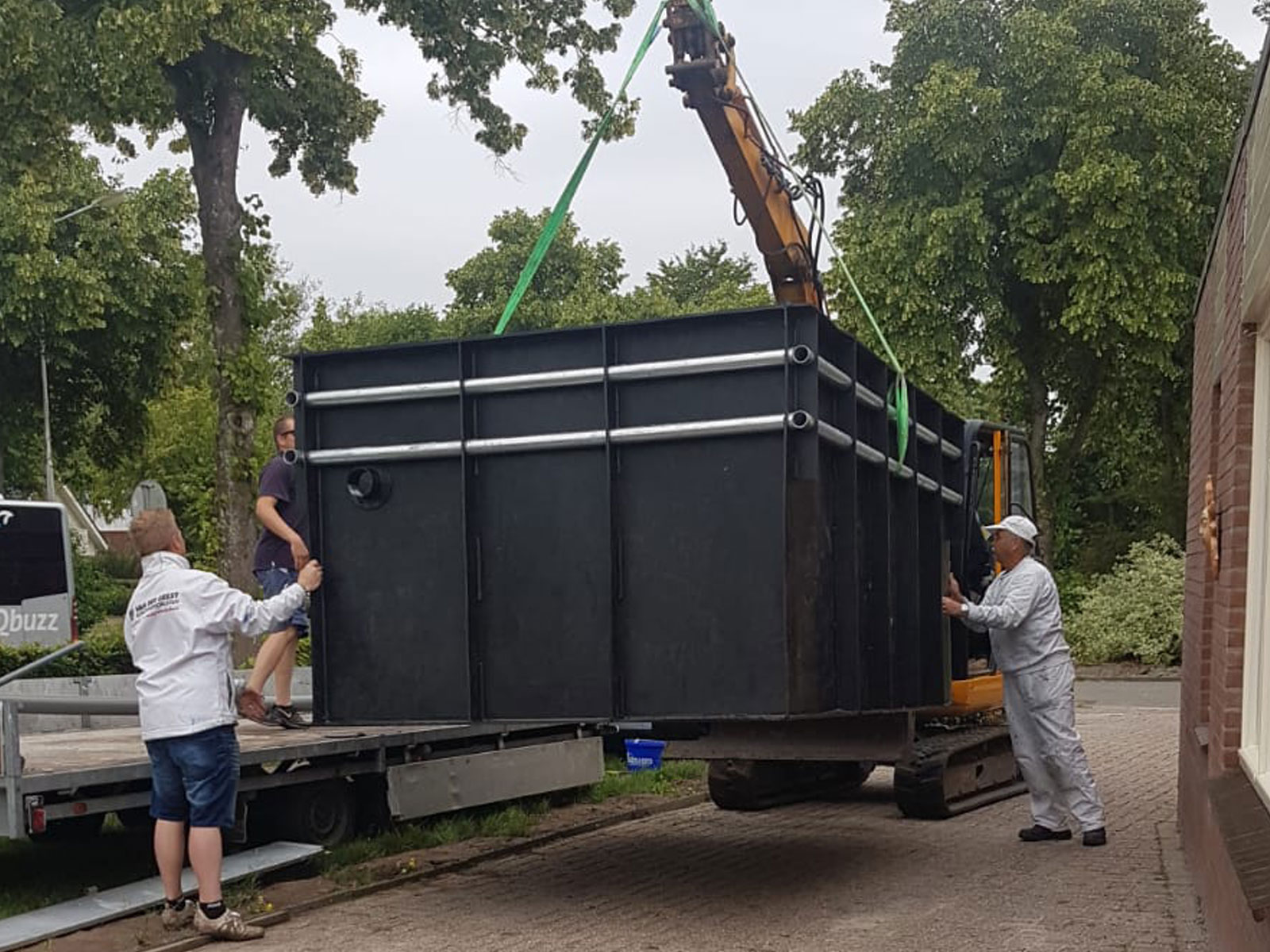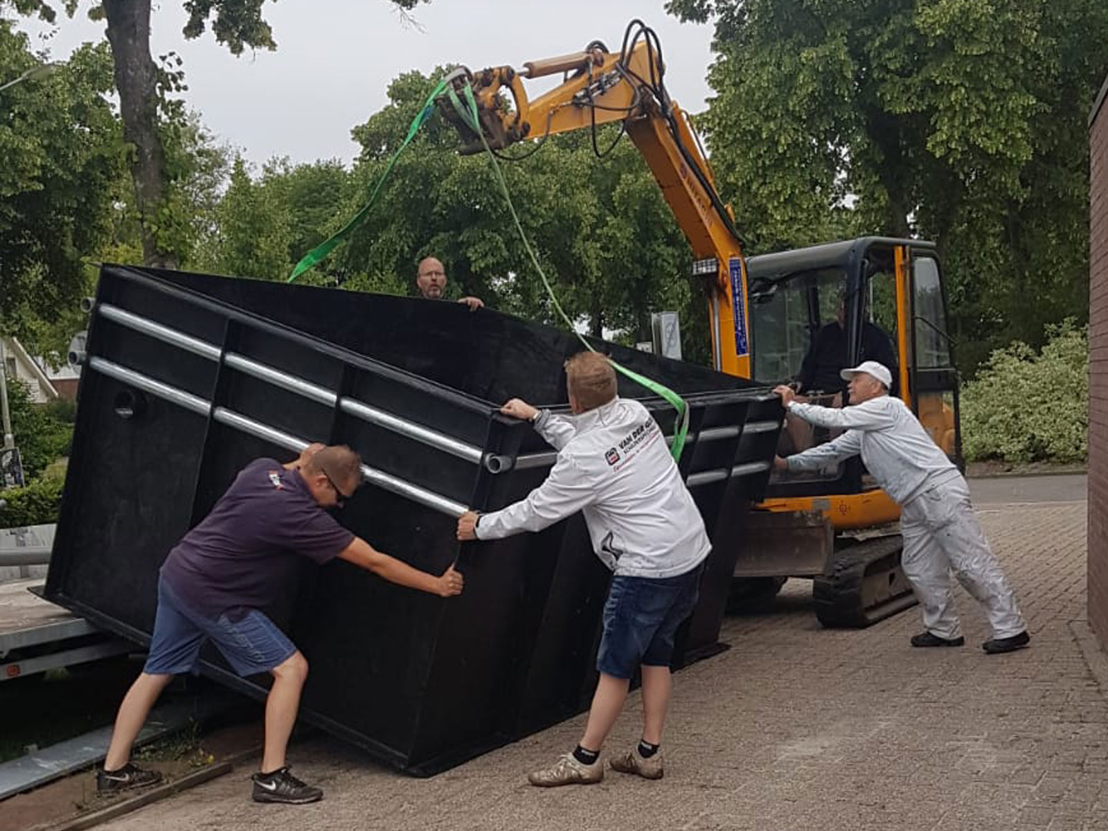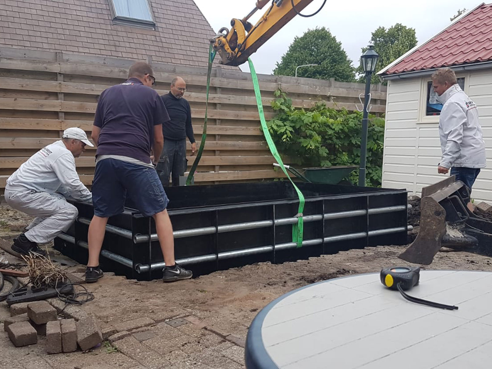 Zoals gebruikelijk bij onze projecten, werd de vijver met precisie op zijn plaats gebracht met behulp van een kraan. Dit zorgvuldige plaatsingsproces garandeert dat de vijver perfect geïntegreerd wordt in de omgeving, met minimale verstoring van de bestaande tuin of landschap.